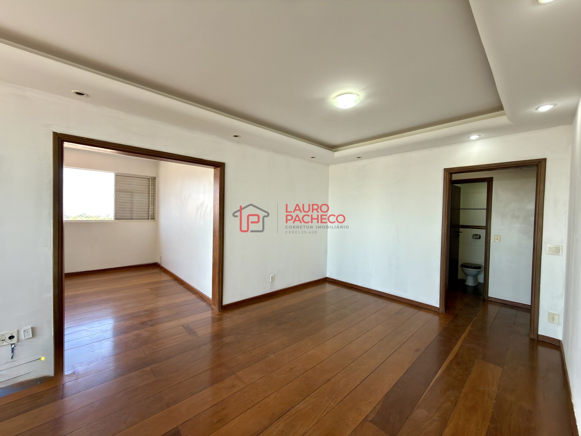 ▫️ Sala ampla para 2 ambientes, com piso maciço de madeira, lavabo e acesso direto ao elevador social